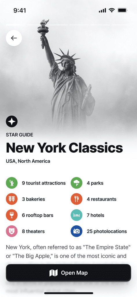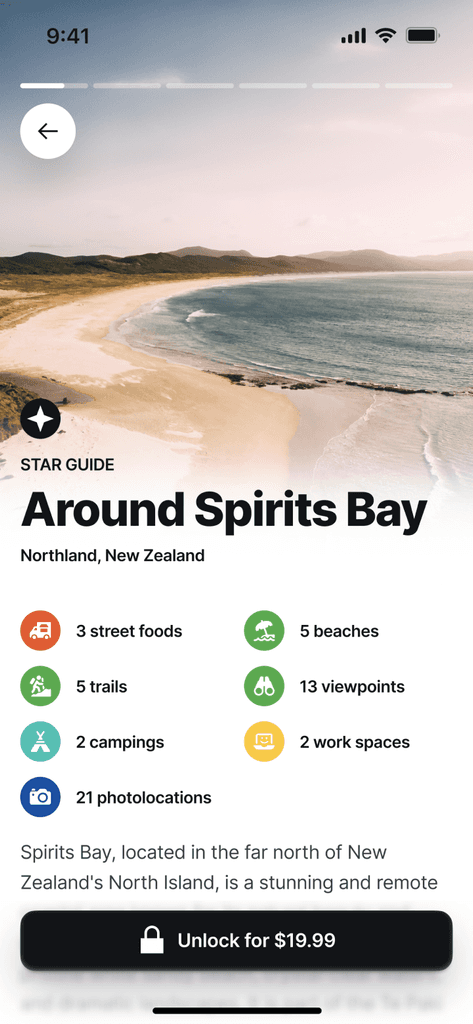 Before buying a guide, travellers can view it's outline, which includes locations summary, brief description and a map showing the area where recommended locations are in.